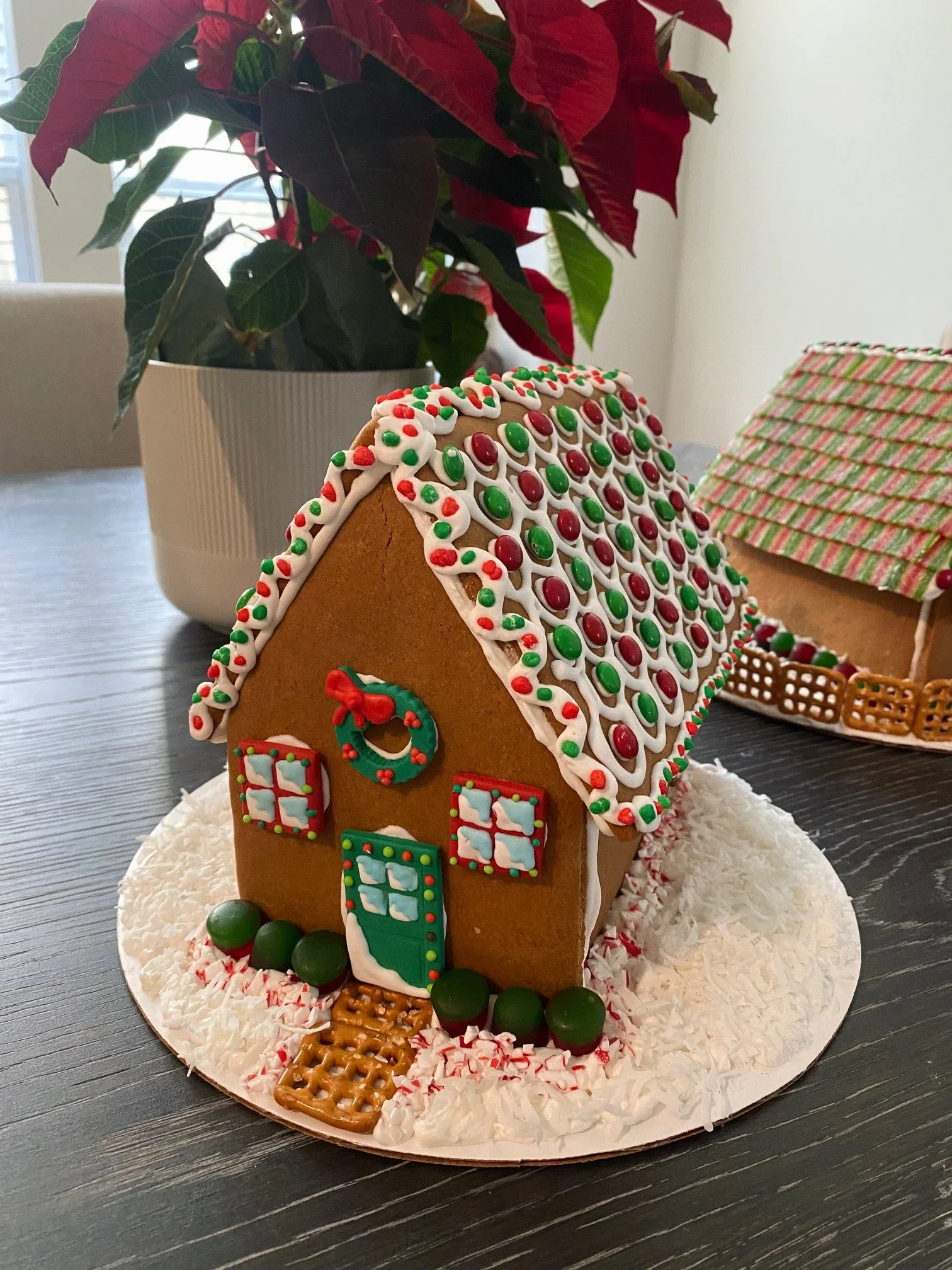It is best to put these houses together in stages to let the icing harden. Attach house ends to sides. Lay one side of roof flat, pipe a line of frosting and attach second side at an angle using a glass or mug to prop roof panel. Let harden several hours or preferably overnight. When set, apply icing to front and back ridge and set roof on. Fill in any gaps with icing.